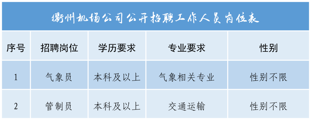 本次招聘采用面向社会方式公开招聘,招聘信息通过浙江省衢州机场管理有限公司微信公众号发布。