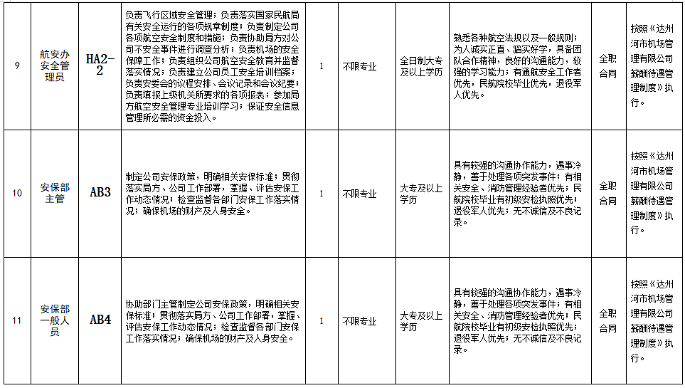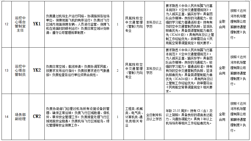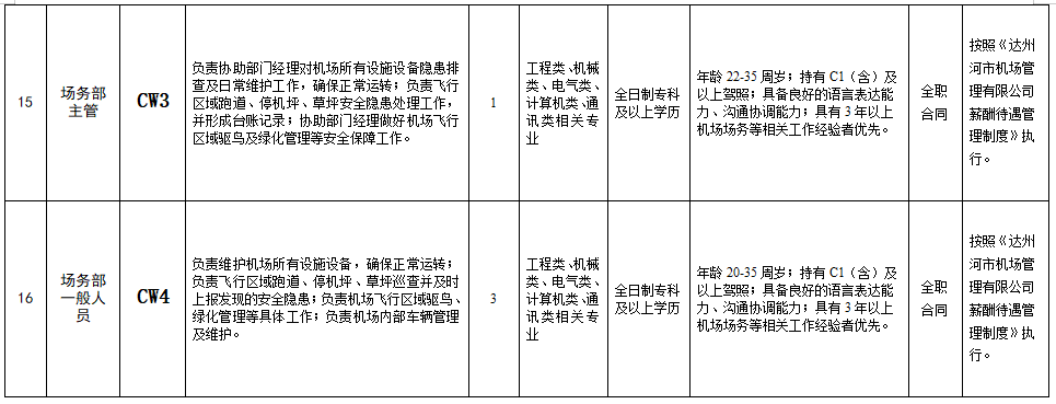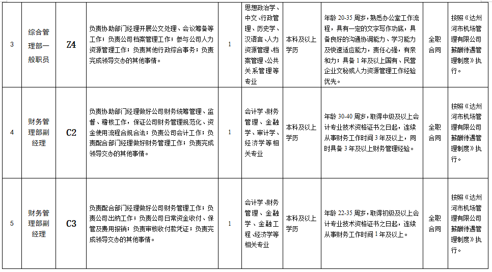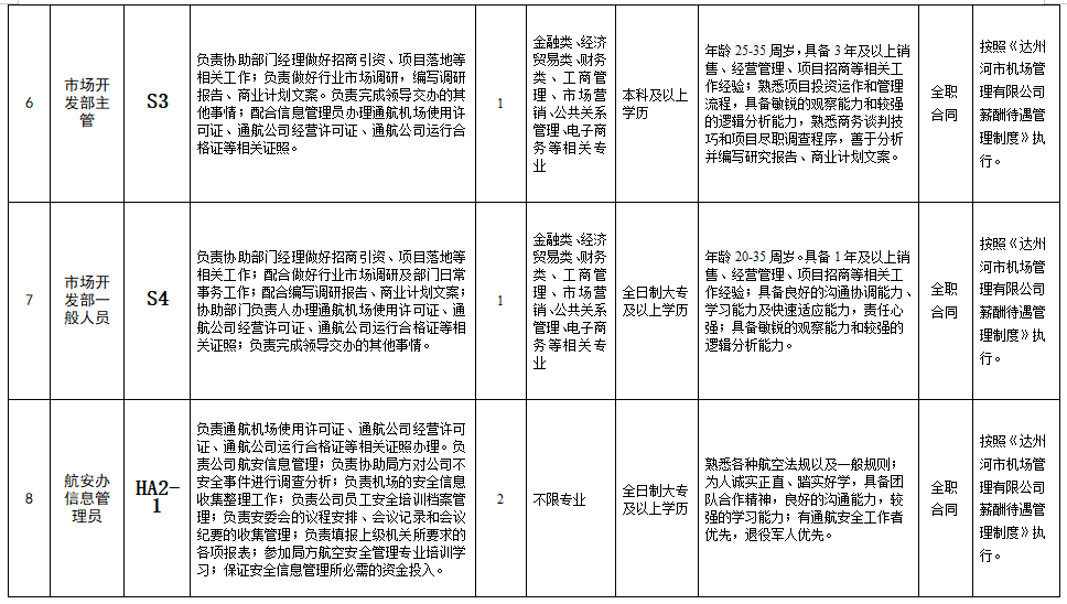 达州河市机场管理有限公司成立于2022年4月25日,注册地位于四川省达州市高新区长田新区三中心办公大楼十楼四十六号。经营范围包括许可项目:民用机场运营;旅游业务;餐饮服务。(依法须经批准的项目,经相关部门批准后方可开展经营活动,具体经营项目以相关部门批准文件或许可证件为准)一般项目:旅游开发项目策划咨询;会议及展览服务;租赁服务(不含许可类租赁服务)。(除依法须经批准的项目外,凭营业执照依法自主开展经营活动)。因工作需要,经研究决定,特面向社会公开招聘公司员工20名。现将有关招聘事项公告如下。