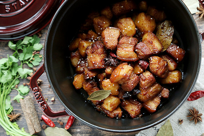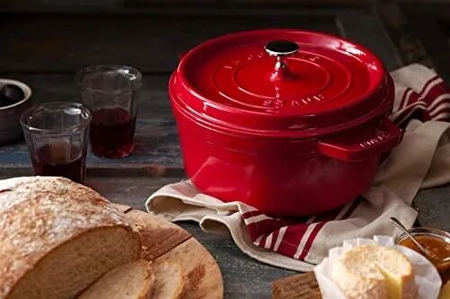 但是纯铁锅有一个问题,就是高温烹饪时,食物容易粘在锅底。而且如果一下没有处理好,就会生锈。所以,我还是买了Staub的珐琅锅(还有他家的樱桃红珐琅烧水壶和磨胡椒的瓶子)
