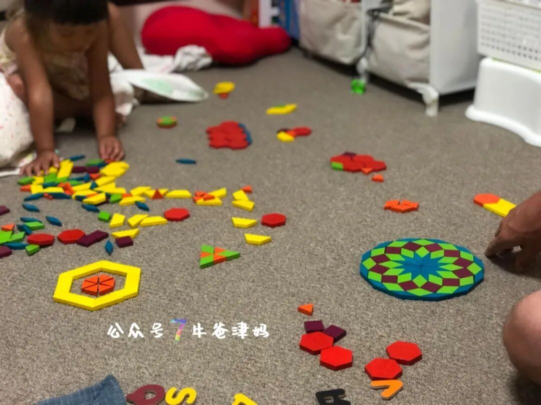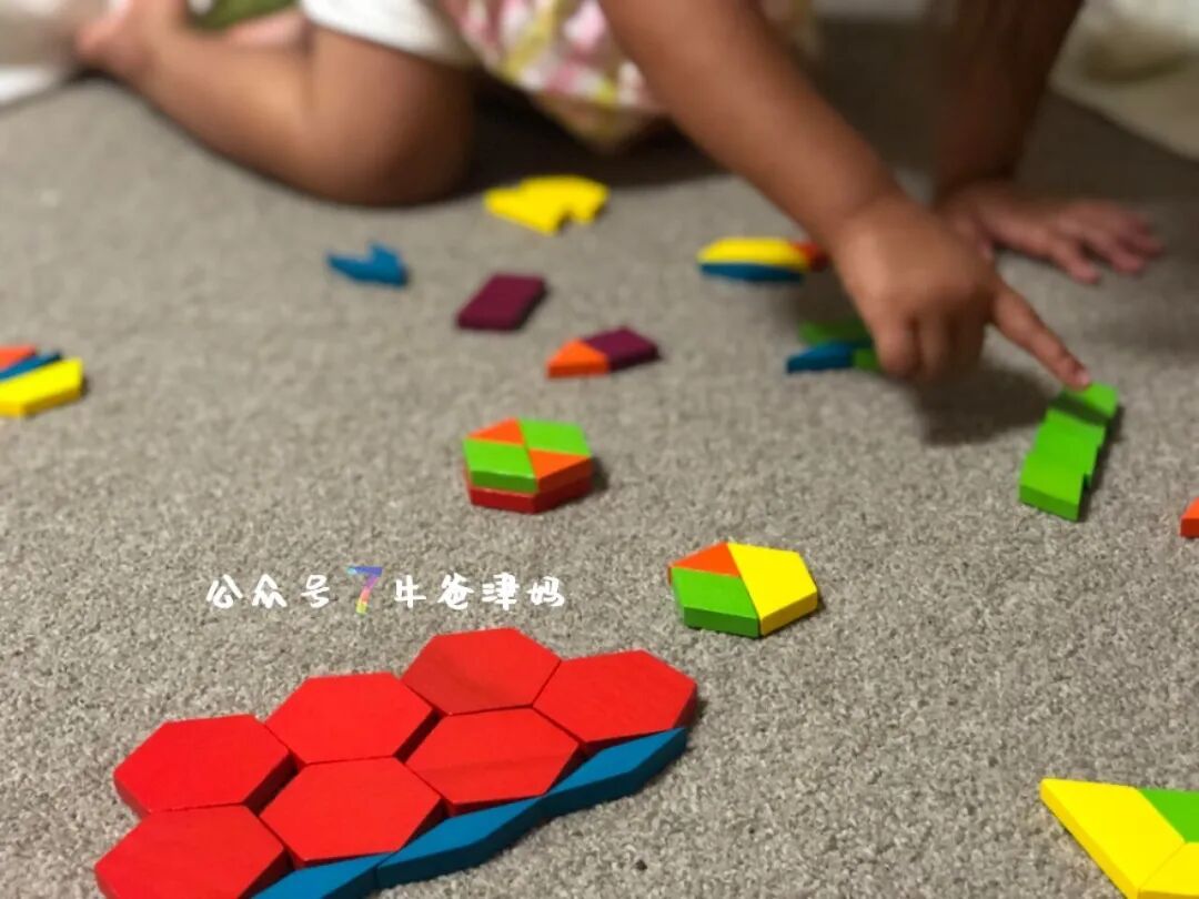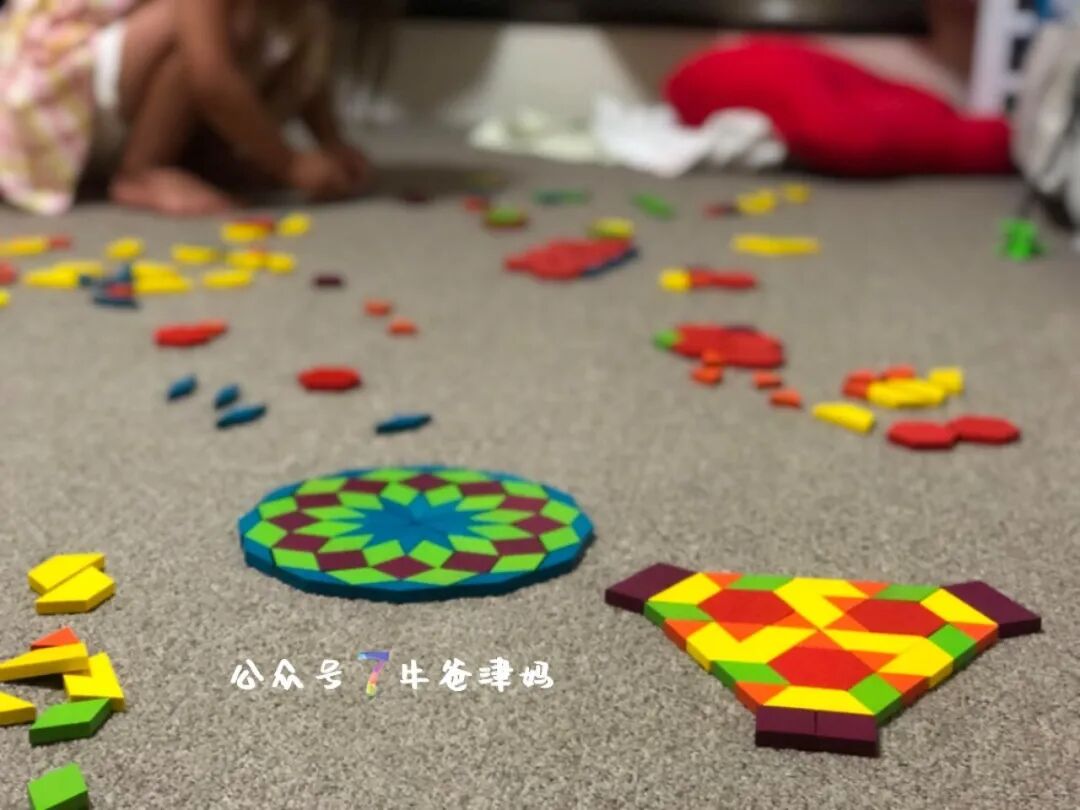 小7本来对拼几何图形不怎么开窍。但这回受了爸爸气场的影响,忽然就自发地开始用不同形状拼起六边形来。