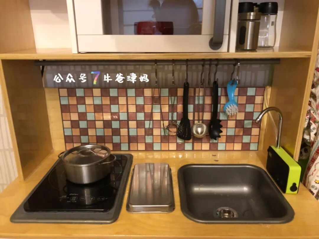 贴上防瓷砖的贴纸,挂上小号的厨具(替换掉了部分宜家儿童玩具厨具),摆上调料瓶。