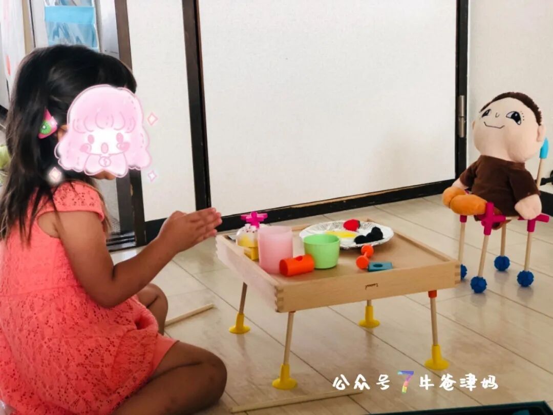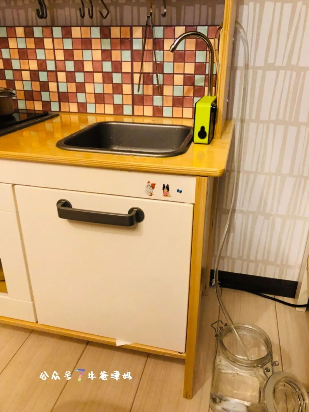 之前有一回她去一个小姐姐家玩,满屋子的玩具她就偏爱人家的儿童厨房。回家之后,我看她把锅子放在地上“做饭”,于是在她两岁半的时候,我就给她置办了一套宜家儿童玩具厨房。