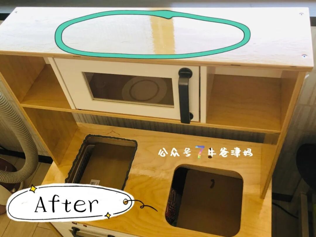 宜家儿童厨房的木板表面,本来涂有一层薄薄的清漆。但是长时间沾水估计会烂,而且沾到油渍难以擦出。