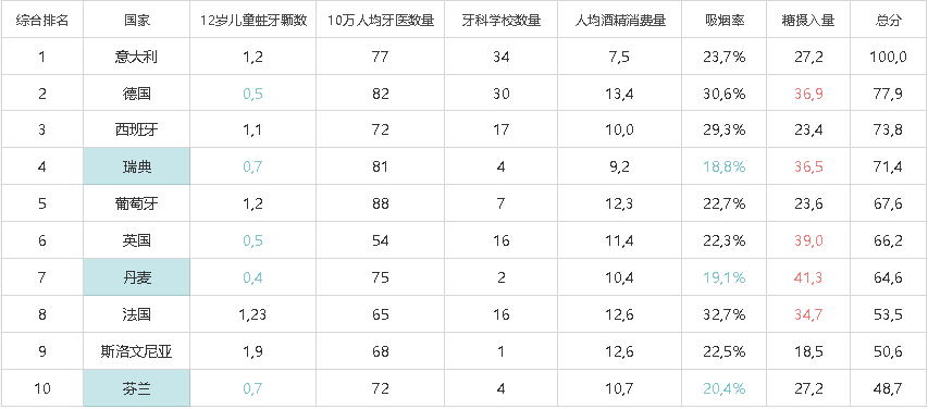 2020年,有人对欧洲 26 个国家的牙齿护理综合情况进行了排名和分析: