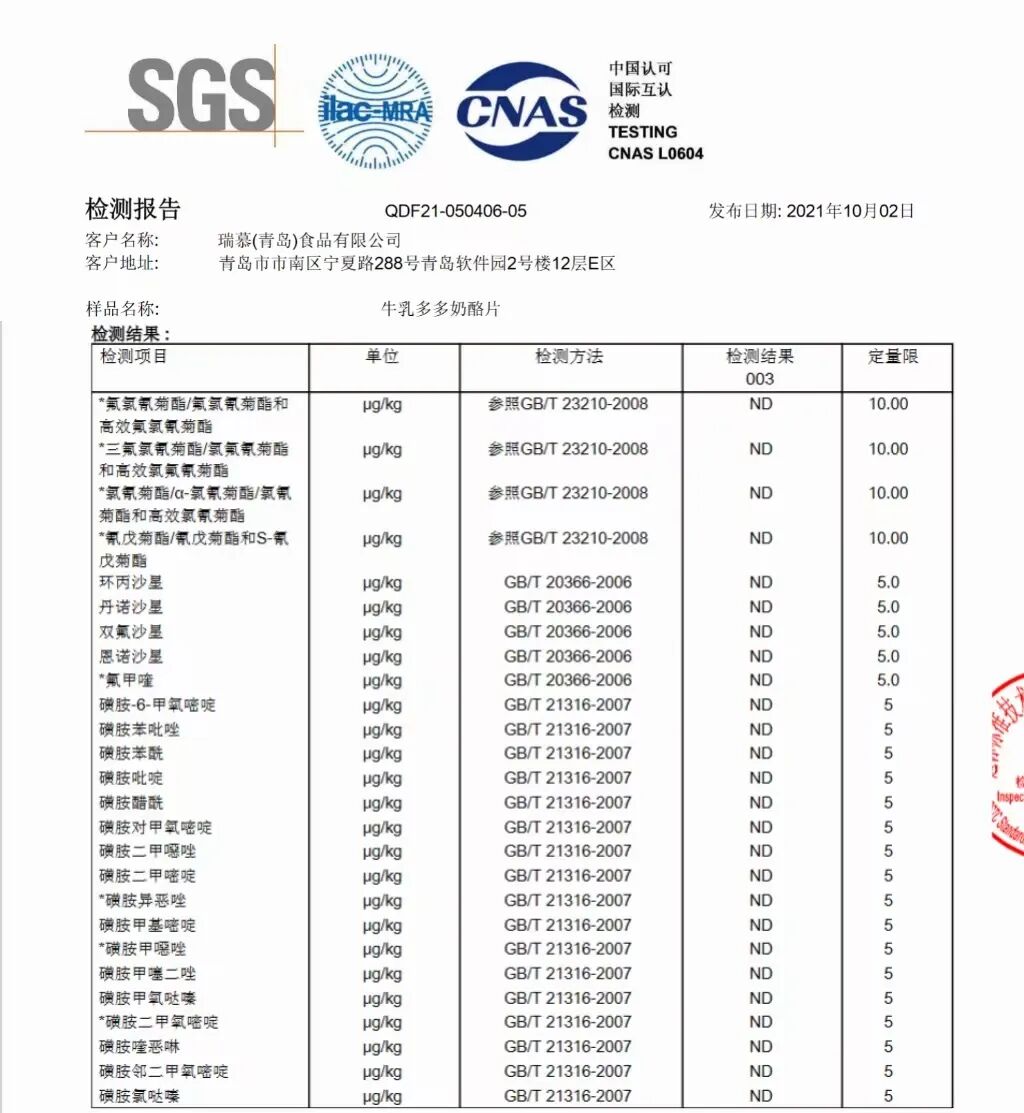 以瑞慕牛乳多多奶酪片为例:我国国标定量限为0.3~500单位,而瑞慕奶制品的激素和抗生素检测结果,均为“ND”(未检出)。