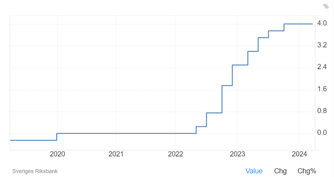 十年前我们买第一套房子那会,利率几乎为零,买房几乎只用每月按比例归还本金;而现在瑞典央行贷款利率涨到了4%,实际购房利率得有4.6%左右。
