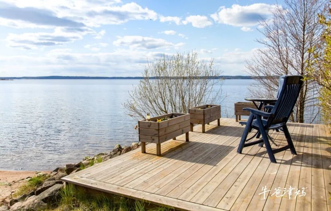 早晨在阳光明媚中醒来,看到湖面闪闪发光。中午不是太冷,跳到湖里畅游一会或者在湖景边喝杯咖啡。当一天接近尾声时,在水边的日光浴露台上点燃烧烤架,小7可以在旁边玩水玩沙。如果突然开始下雨了,可以跑到桑拿放里取暖喝啤酒,然后在客厅的壁炉里生火。