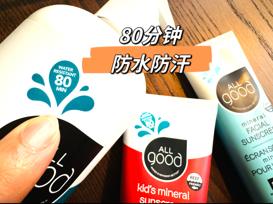 All Good全线防晒霜都“80分钟防水”,SPF30高倍防晒,超适合滴汗的炎炎夏日和海边浴场。(PS,SPF30防晒霜可以阻挡约97%的紫外线,相比较而言SPF50可以阻挡大约98%,防晒差异不大但肤感差别很大。)
