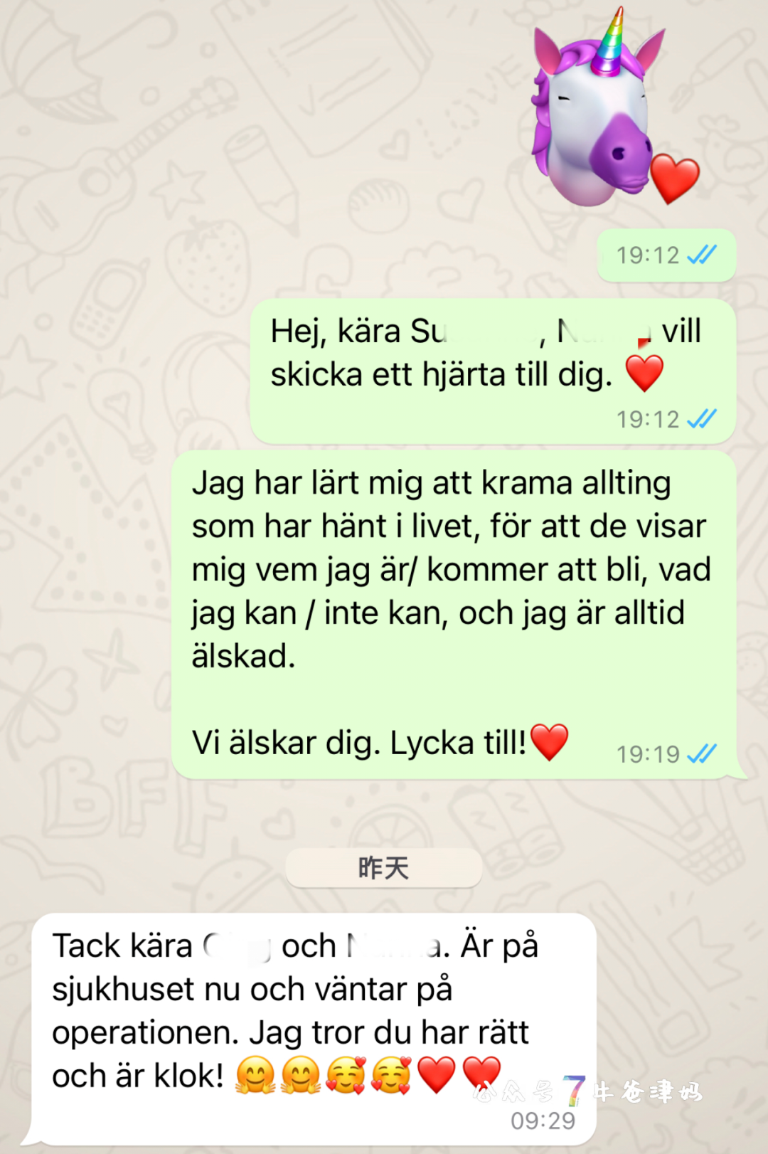飞吻独角兽是小7精心挑选的,文字也是我在思考几天后最想对她说的话。