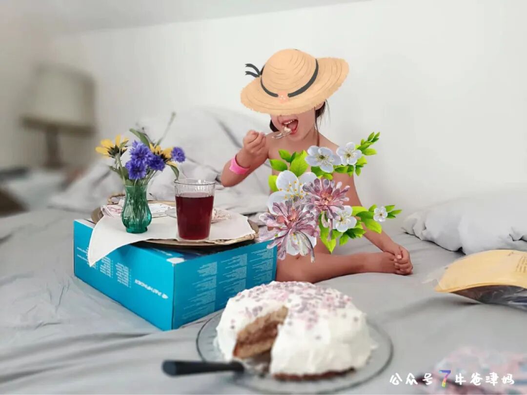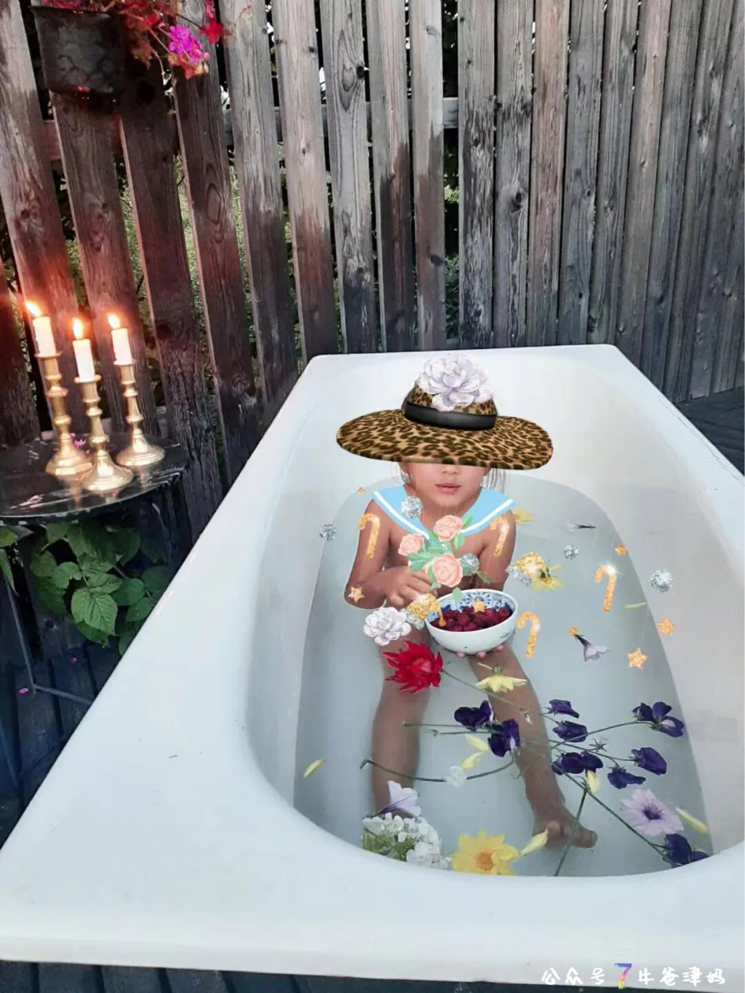 吃过“生日宴”,小7像公主一样被伺候着在后院的露天浴缸里吃树莓,里面洒着她自己选的鲜花。