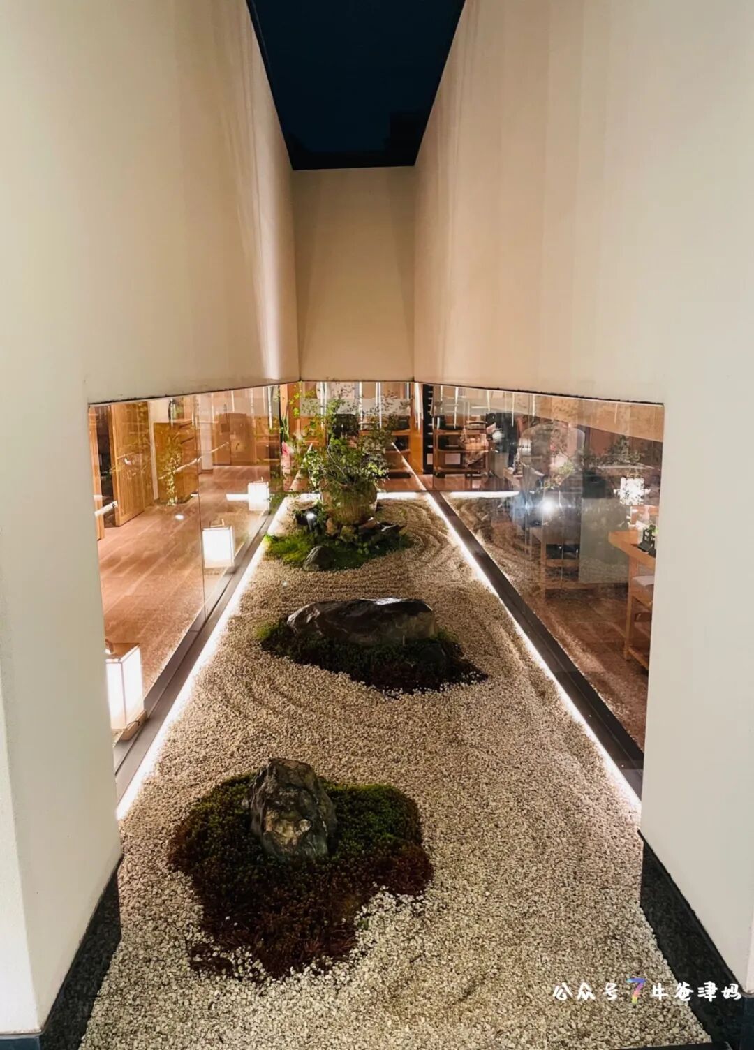 他们在房屋中间做了一个小天井,窄窄的。把日式小庭院搬到这里,就成了全餐厅都能欣赏到的美景。