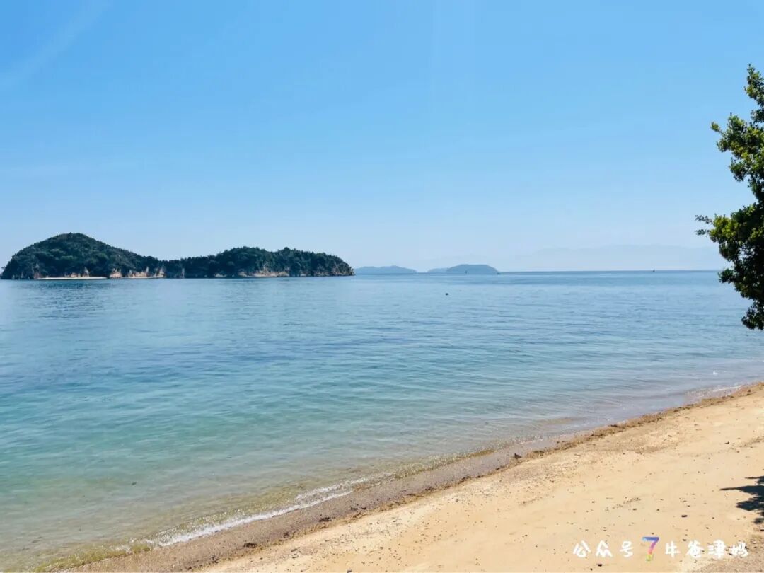 比如竹林是黄色,被海水拍湿的岩石是深褐色,远处的岛屿是海天的灰蓝色。