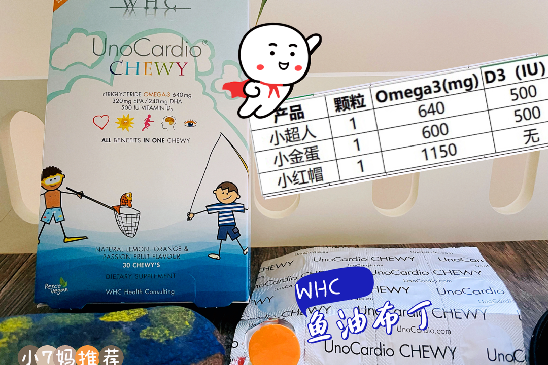 它是布丁状,但主成分还是雷打不动的高含量鱼油,其他配料也完全是天然成分提取。一片布丁Omega-3含量高达640mg,跟一粒WHC的小金蛋鱼油胶囊的含量相当。