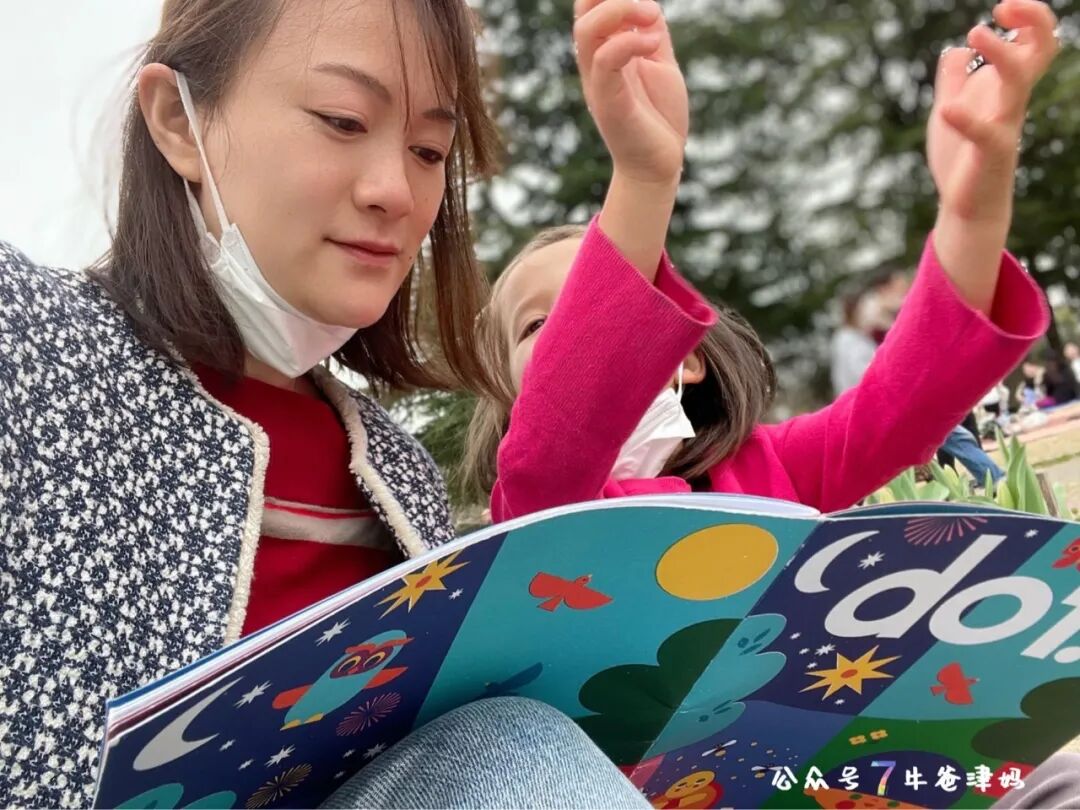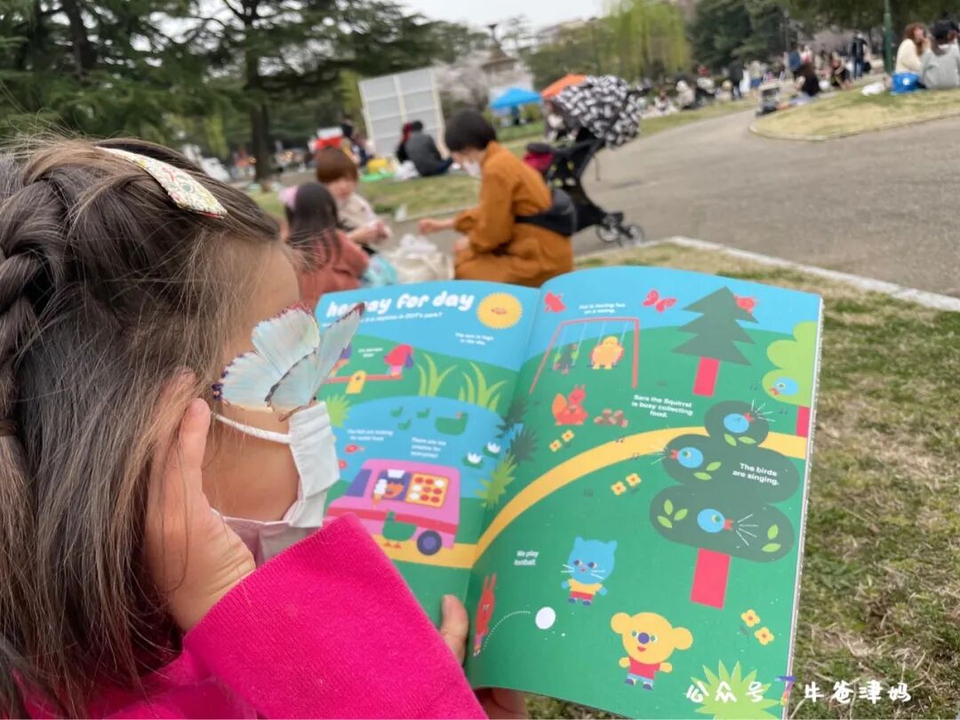 周围人山人海,大家都是在赏花、野餐、打球或聊天。旁边也有一个有儿童游乐设施的公园,我以为小7不能安静下来看书,会想着去那里玩。