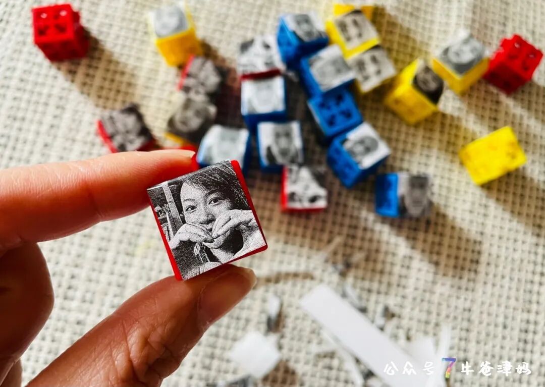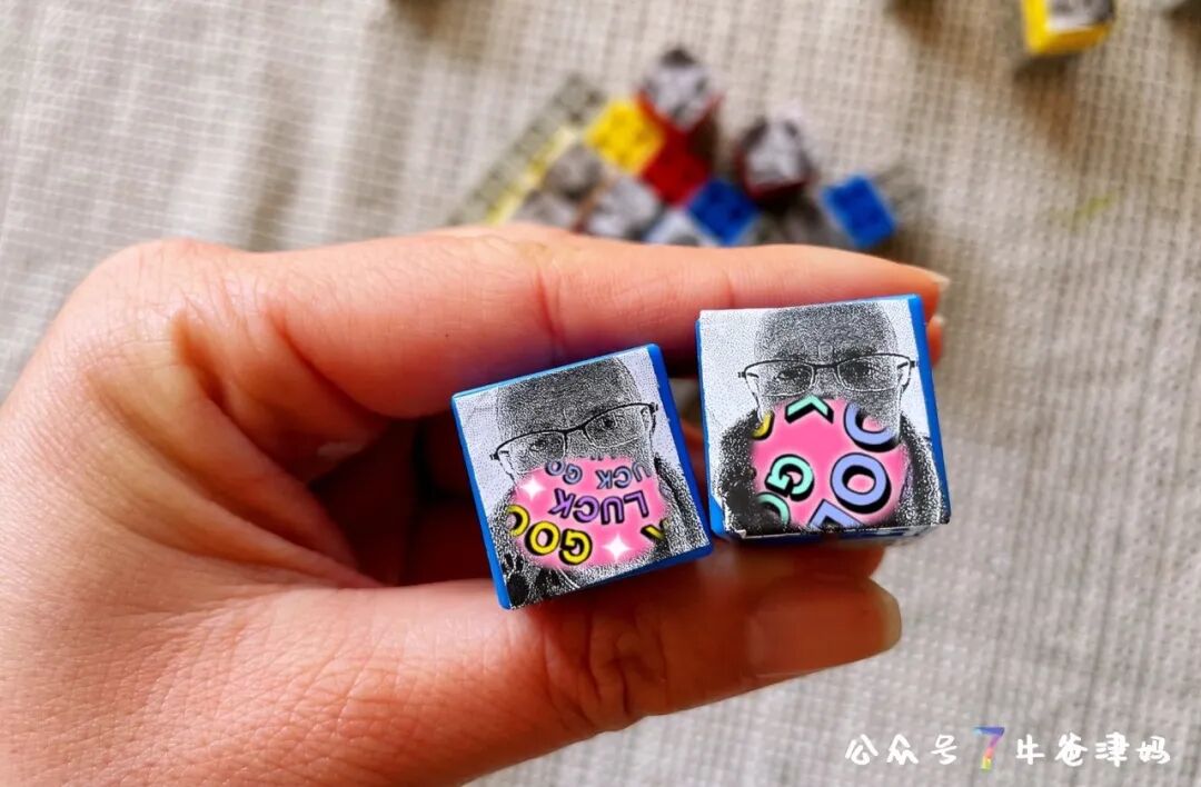 再摸出一箱积木,把“表情不干胶”贴在三种颜色的方块上。