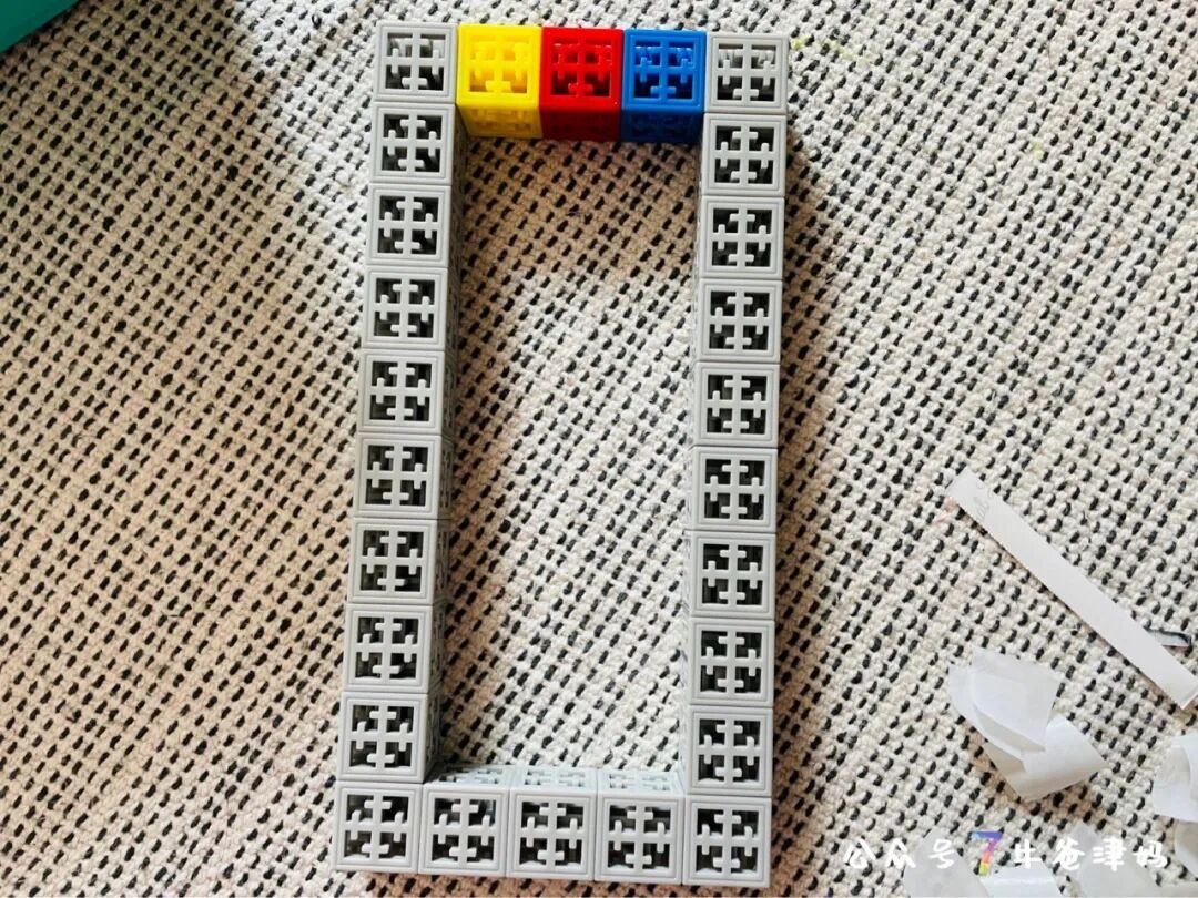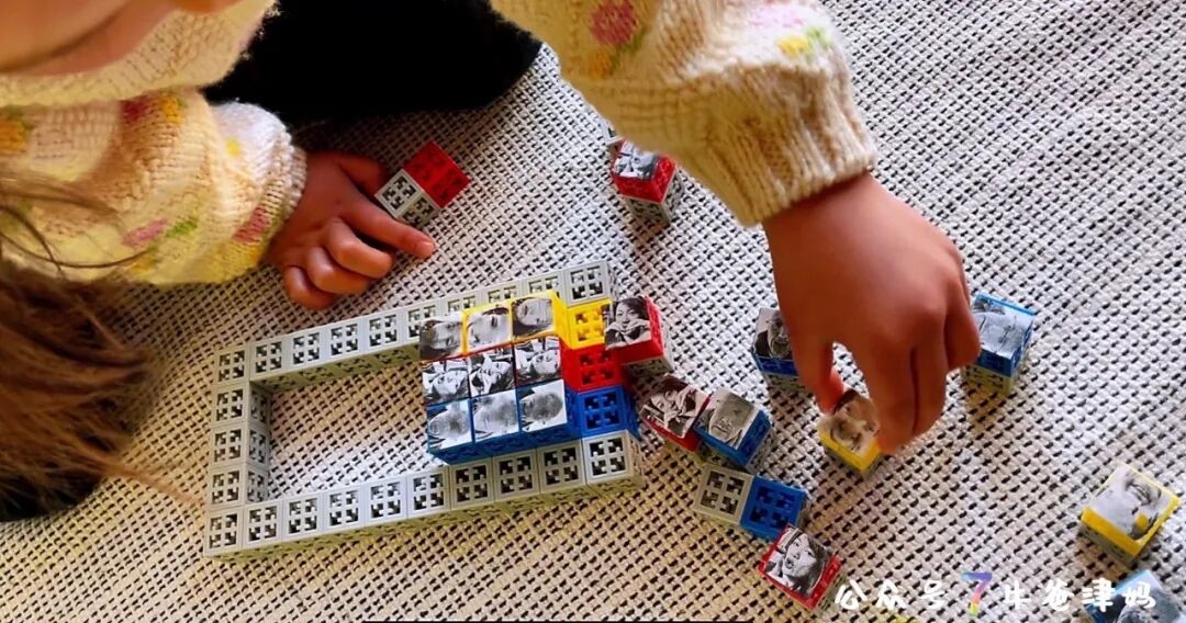 用灰色积木“裱个做题框,暗示小玩家在每种情况下都需要摆放三种不同颜色的积木,以及总共的可能数。