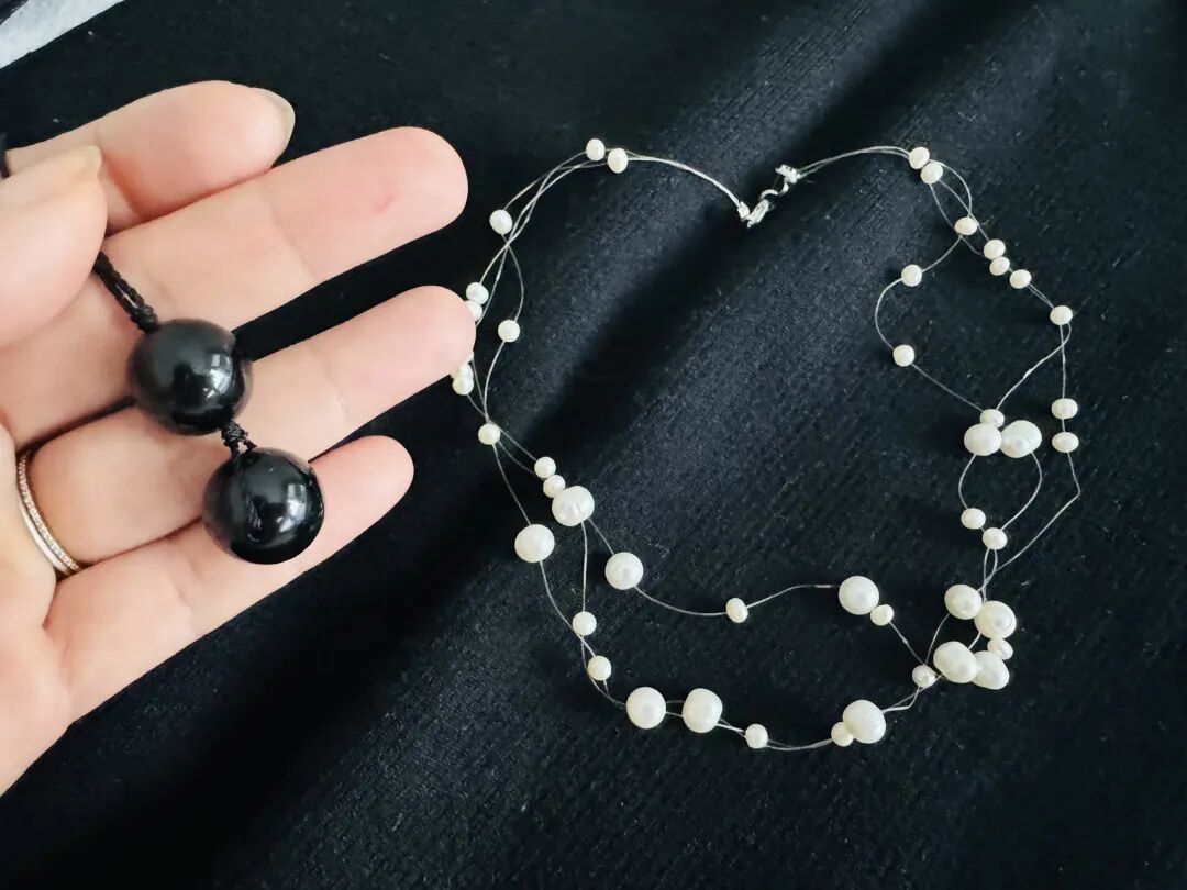当时我看上了这条99块的珍珠项链;同时还买了两颗黑曜石的珠子,穿了一个有点法式样子的经典款。