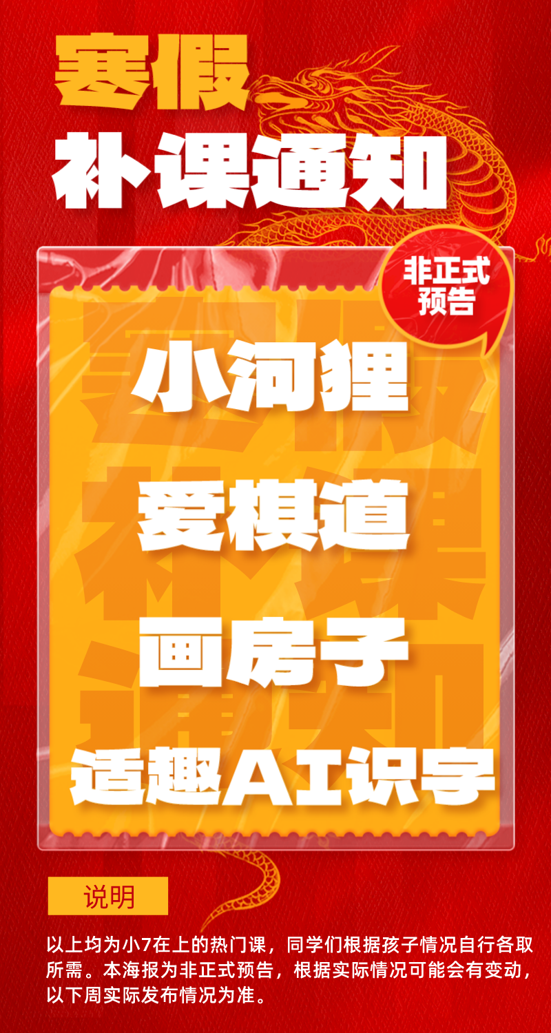 大概计划有适趣AI识字、小河狸搭建、爱棋道围棋、画房子录播/直播社区课这些小7在上的热门课(也可能有变化),同学们根据孩子情况自行各取所需就好,我就不分头一一写文章了。