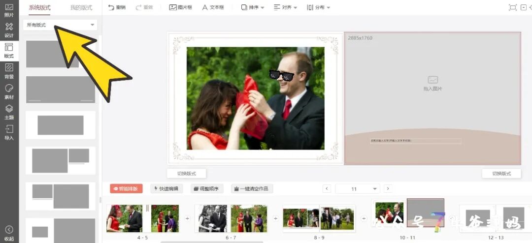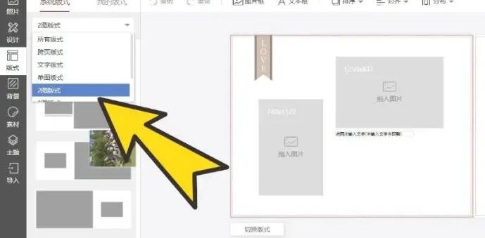 在左边菜单栏可以选择不同的版式,从单图、跨页甚至到5图、6图、8图。