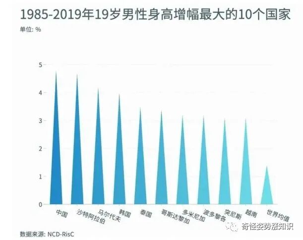 在对全球国家平均身高的调查中,以1985—2019年的数据为例,针对中国19岁青少的平均身高研究,相比较于1985年中国排名的第150位而言,2019年中国19岁青少年的身高一跃飞升到第65位。