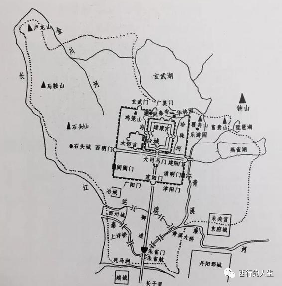 与北魏不同的是,南朝的建康城未经战火,东晋衣冠南渡对原东吴的建康城进行了改扩建,皇城东移,南面正对东吴时期的御街,并将其延长,从皇城的宣阳门,走五里出朱雀门则是有一横跨秦淮河的浮桥,可达祭天的南郊。这条线是建康城的南北中轴线,宫城与内城间的五里御道边分布官署衙门,沿秦淮河左右建有太庙,官邸主要分布在御道府衙外侧,民宅沿秦淮河而建,城门有12个。建康城是以皇宫为中心,宫墙有三道,外城八里。面南背北,正门在一条线上是大司马门与宣阳门,御道两里,两侧开挖御沟,沟旁种槐、柳。出大司马门的横街,正对东、西城正门,宫城北有华林园,覆舟山有乐游苑,北有玄武湖,湖水引入华林园、天渊池和宫内溪流,再注入护城河。