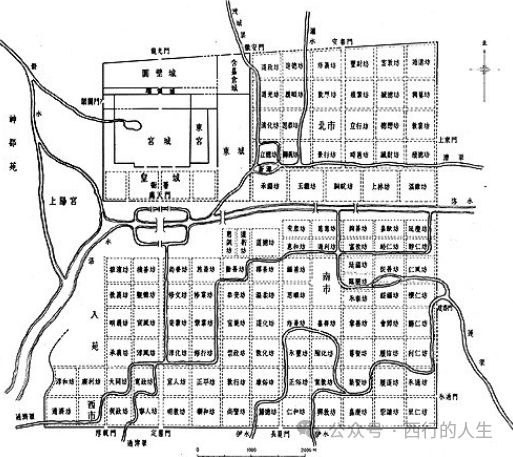 宫城位于西北隅,意味着天子宫阙位于天上的紫微垣;皇城位于宫城之南,象征着天上的太微垣;外郭城位于皇城和宫城的东、西、南三面,应对着28星宿。
