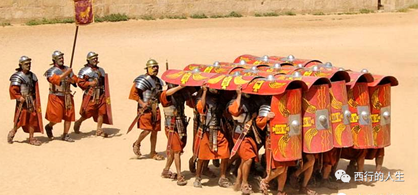罗马军队基本组织单位是百人队,装备木制牛皮盾和标枪、短剑,当遭到弓箭射击时,会收拢队形,第一排步兵以蹲踞姿势将盾牌拄地,第二排步兵将自己的盾牌置于前排盾牌之上,第三排及之后的步兵将盾牌举过头顶,如同瓦片一般相叠。这种盾阵与中国史料中记录的郅支城外的鱼鳞阵人数与队形相同。