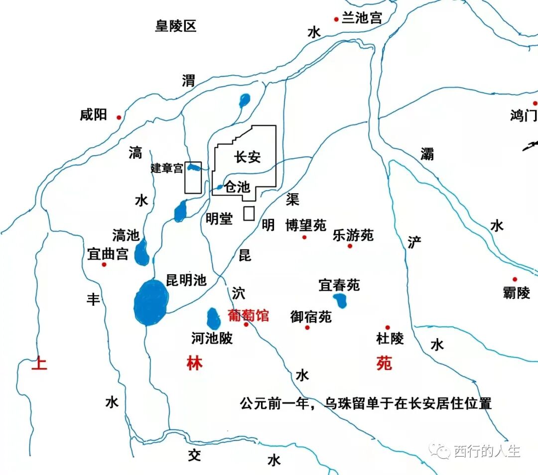 上林苑的葡萄馆应该处于长安城的正南方,“申”位,是指南方,所以把乌珠留单于安排在了那里,其目的是用“太岁”和辟邪的“厌胜之术”镇住单于。这当然是事先特意安排。之前朝中一群官就有“单于自黄河上游来”不吉的说法。