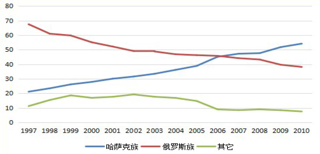 ▲1997-2010年间哈萨克斯坦中北部地区哈、俄两族人口比重对比变化
