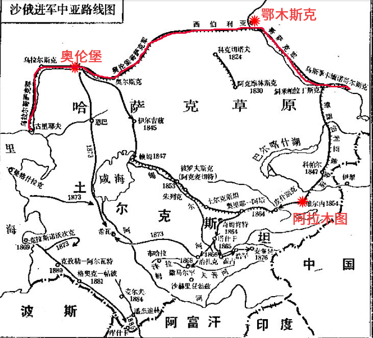 ▲沙俄进军中亚路线图,北方红色长线即为当年沙俄的防线