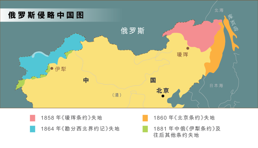 ▲俄国侵略中国领土示意图,阿拉木图等广大领土被迫割让