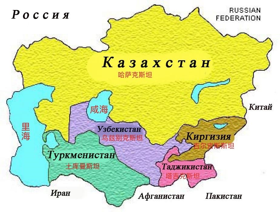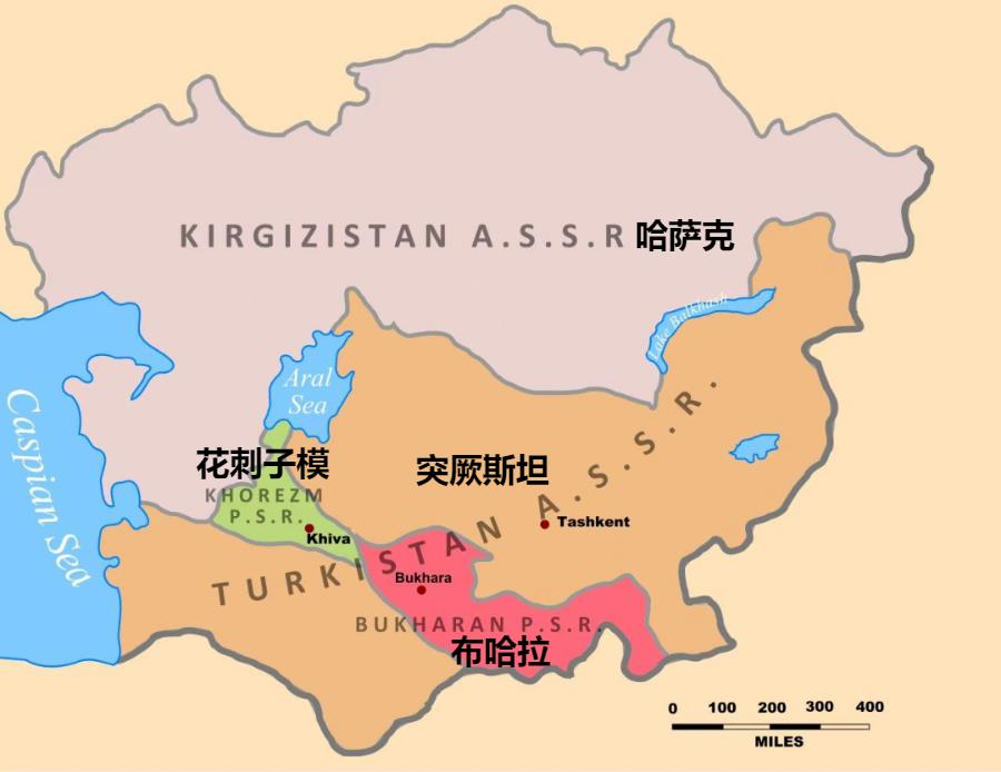 ▲十月革命后中亚被分为哈萨克、花剌子模、布哈拉和突厥斯坦四个苏维埃国家
