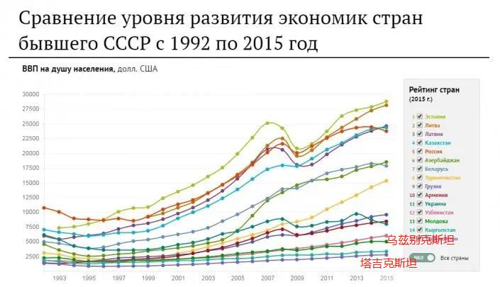 ▲1992年-2015年,苏联各加盟共和国的人均GDP,塔吉克斯坦长期垫底