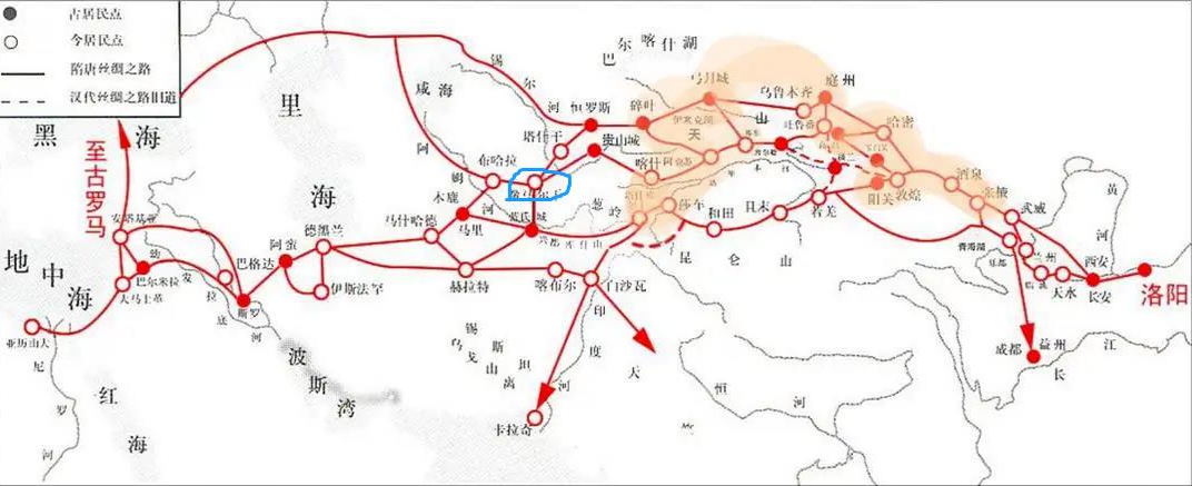 ▲丝绸之路,带动了撒马尔罕(蓝色圈)的繁荣