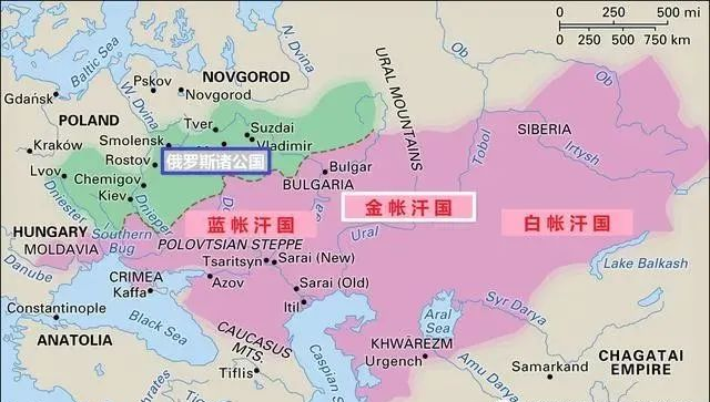 ▲此图中的金帐汗国被称为蓝帐汗国,白帐汗国在其东部地区,两者之间为昔班的封地(日后被称为蓝帐汗国)