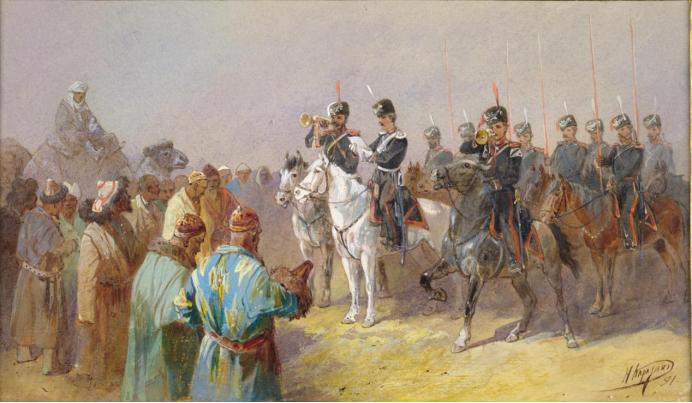 ▲1824年沙俄军队向哈萨克部众宣布沙皇的法令