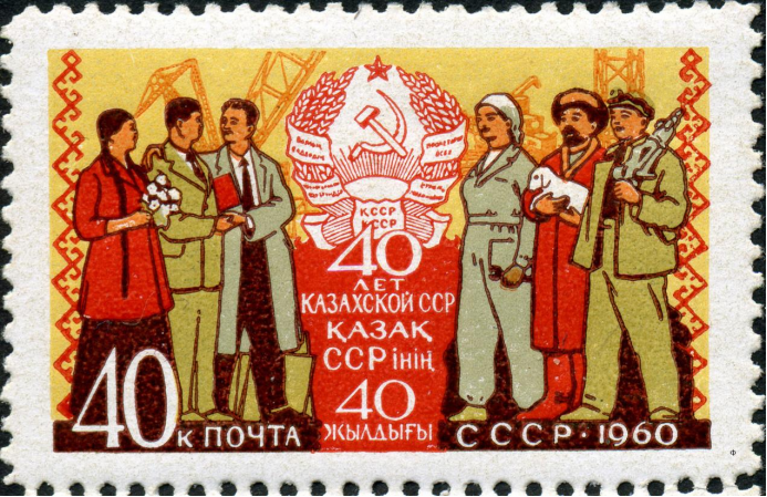 ▲1960年苏联发行的哈萨克苏维埃社会主义共和国建立40周年纪念邮票