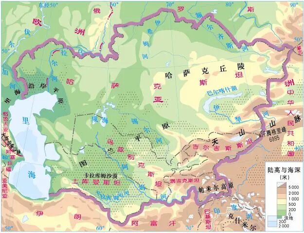 中亚地处亚欧大陆腹地,高山阻挡了海洋的暖湿气流,气候干燥、降水稀少,植被以沙漠和草原为主。但中亚地形由西向东逐渐抬升,盆地开口向西,大西洋水汽在高耸山脉的迎风面,形成了丰沛降水。