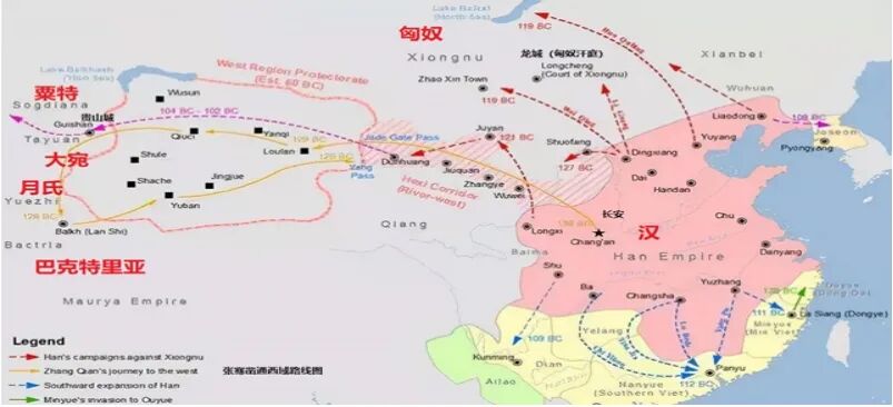 公元前2世纪,来自中国河西走廊,被匈奴逼迫而走的大月氏人,来到了中亚。汉武帝为夹击匈奴,寻找同盟军大月氏人,派遣张骞凿空西域。