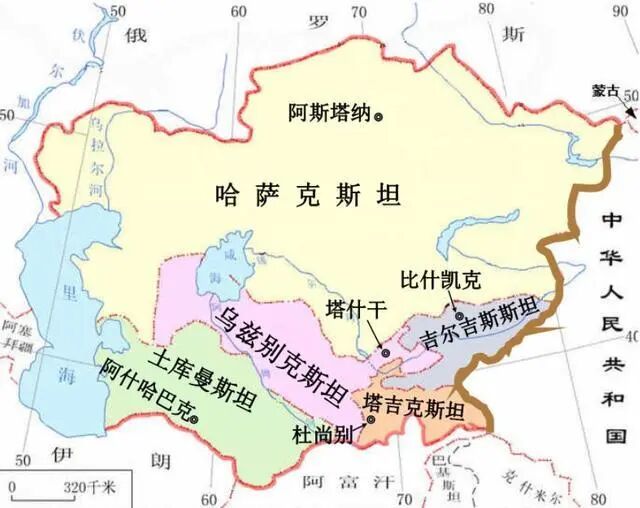 这片地域差不多构成了广义上的中亚,现在的“五斯坦”则是狭义的中亚,他们分别是哈萨克斯坦、土库曼斯坦、吉尔吉斯斯坦、乌兹别克斯坦、塔吉克斯坦。“斯坦”是五国国名的共同特点,而这个词起源于古波斯语。