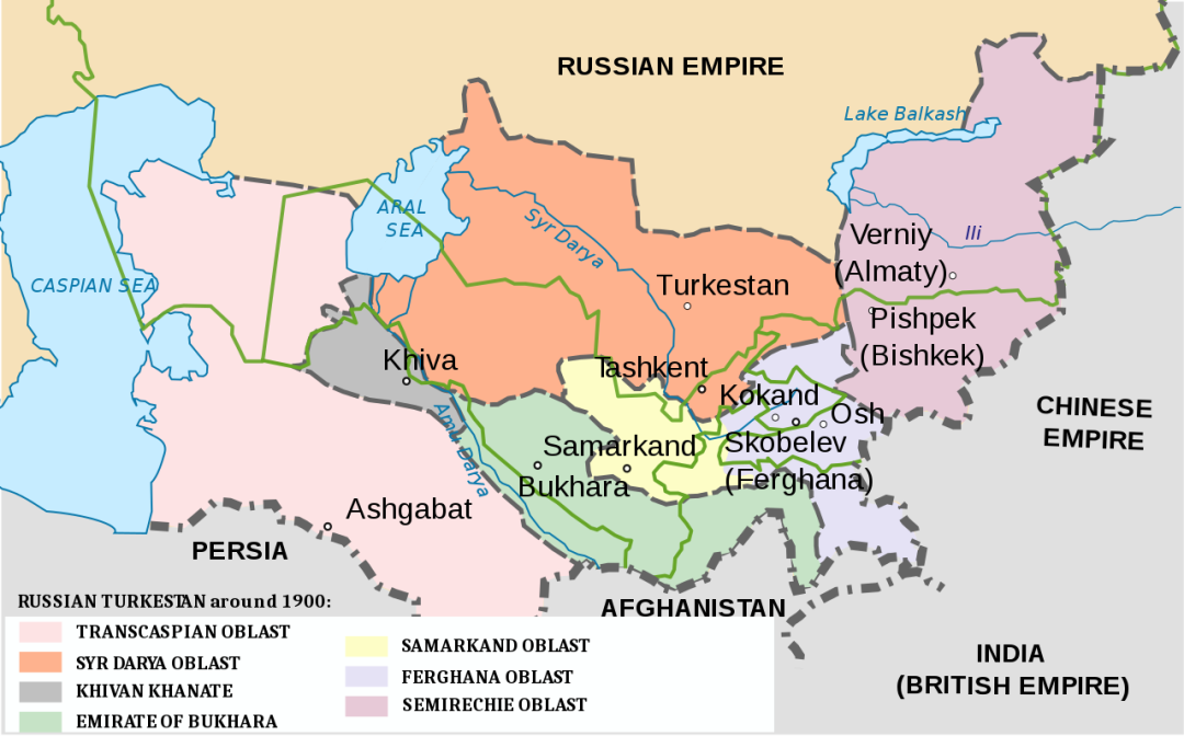 1924年,苏联废除了俄国的总督区,按民族成立各自的共和国,其中哈萨克、乌兹别克、克尔吉斯、土库曼四个加盟共和国,直属于苏联。