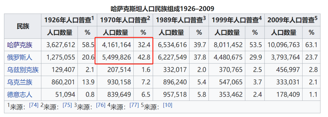 1959年,俄罗斯族占全国42.7%的人口比重(539万),哈萨克族仅占37.8%(529万)。到1991年哈萨克斯坦独立时,全国总人口1600万,哈萨克族仅占人口的40%(640万),俄罗斯族依然占38%(602万)的比重。