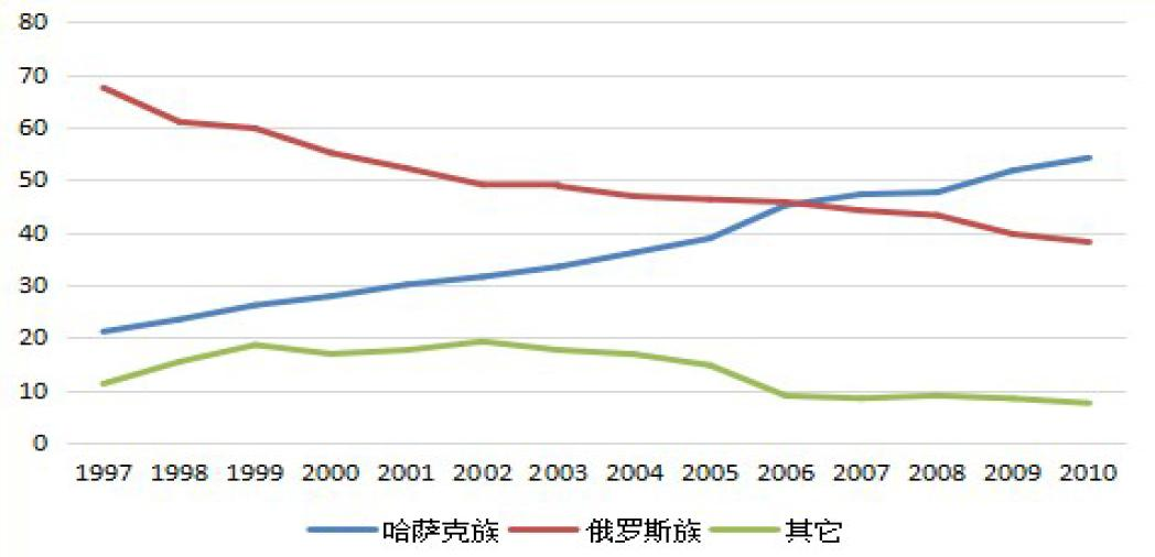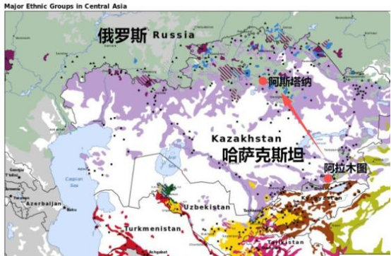 ▲哈萨克斯坦中北部的民族构成变化,俄罗斯族比例逐渐下降