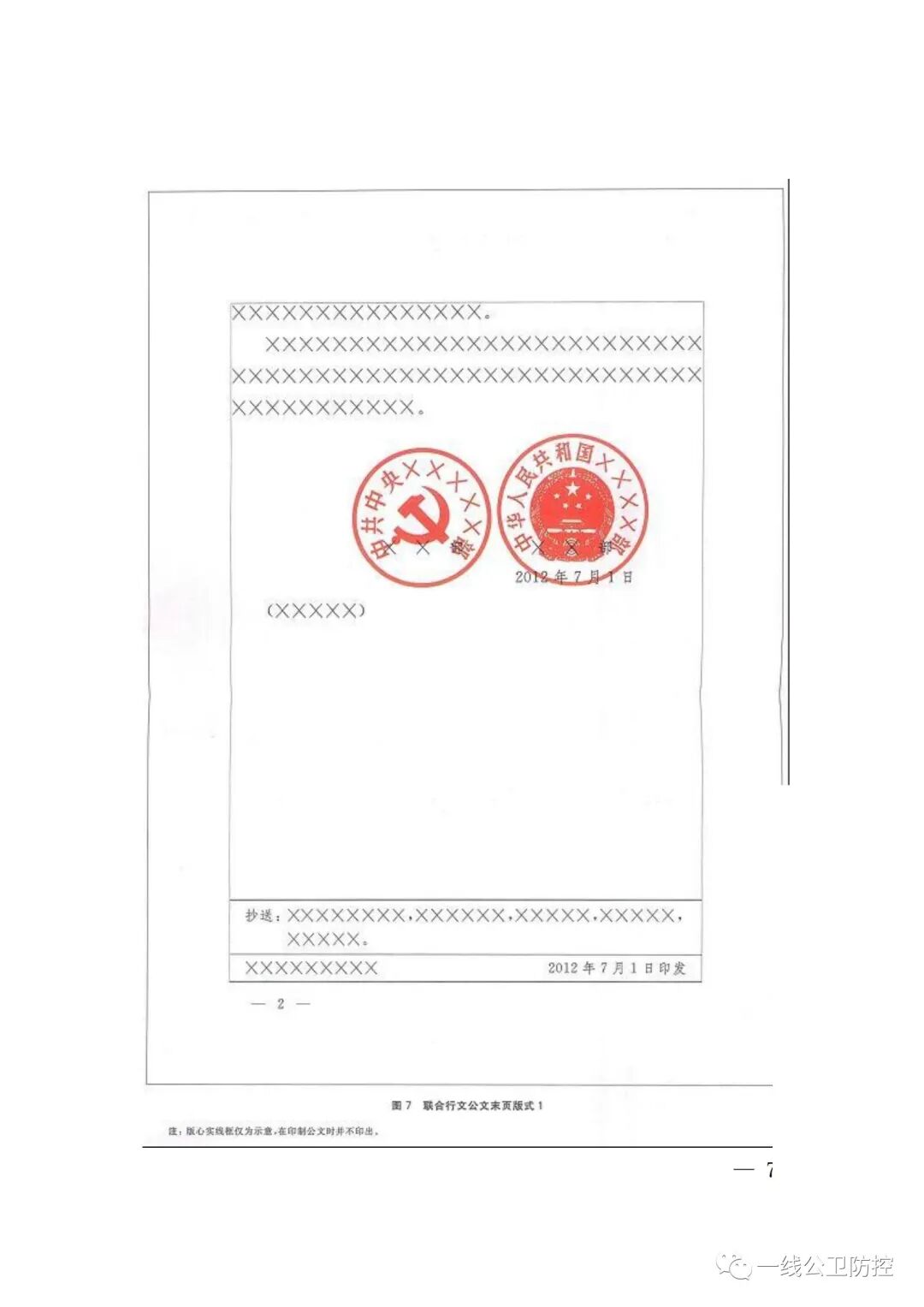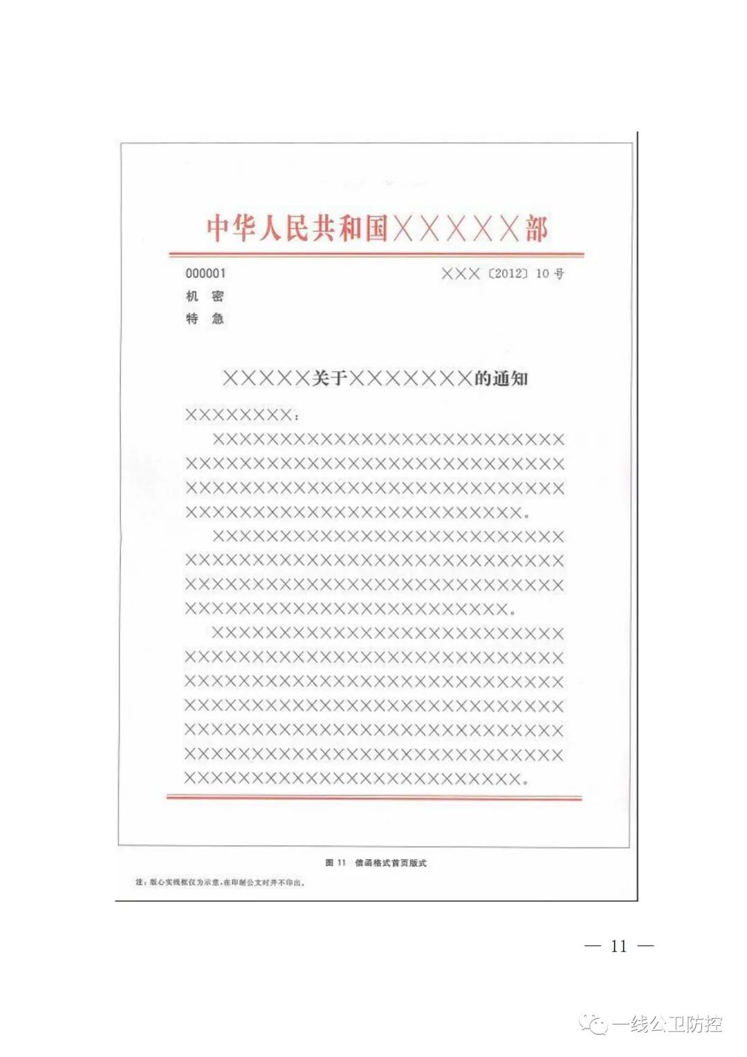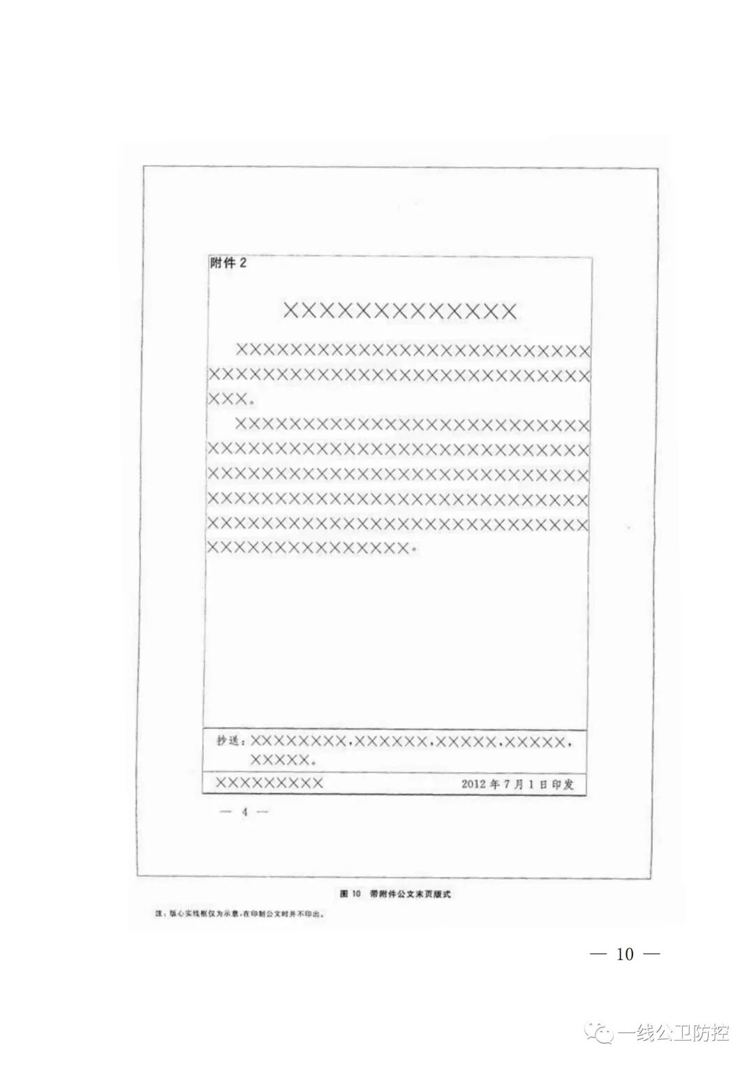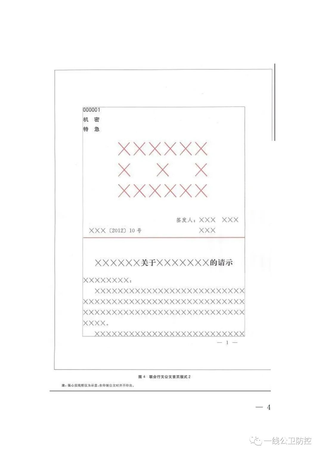 A4型公文用纸页边及版心尺寸见图1;公文首页版式见图2;联合行文公文首页版式1见图3;联合行文公文首页版式2见图4;公文末页版式1见图5;公文末页版式2见图6;联合行文公文末页版式1见图7;联合行文公文末页版式2见图8;附件说明页版式见图9;带附件公文末页版式见图10;信函格式首页版式见图11;命令(令)格式首页版式见图12。