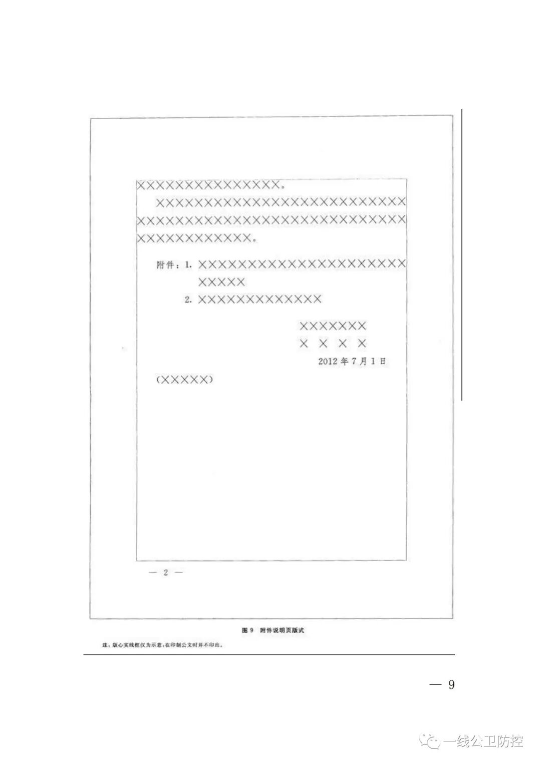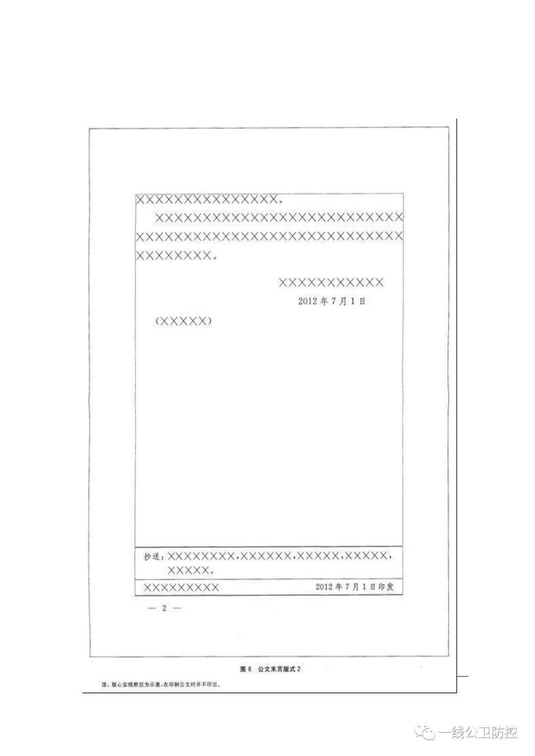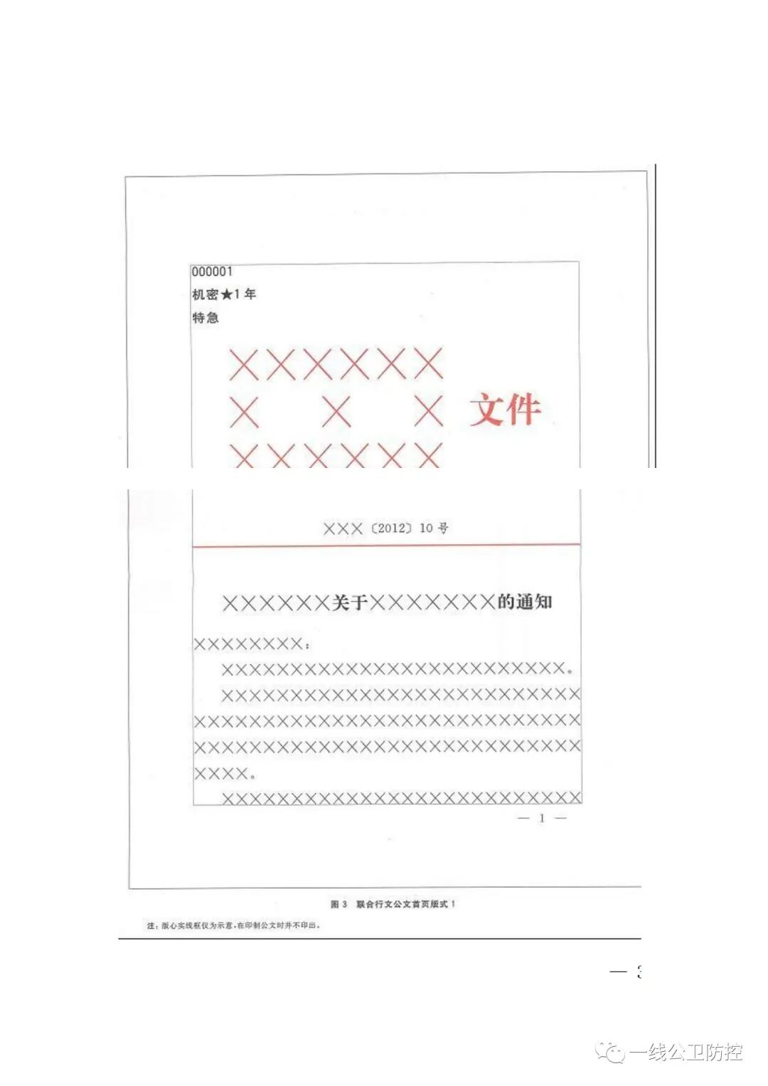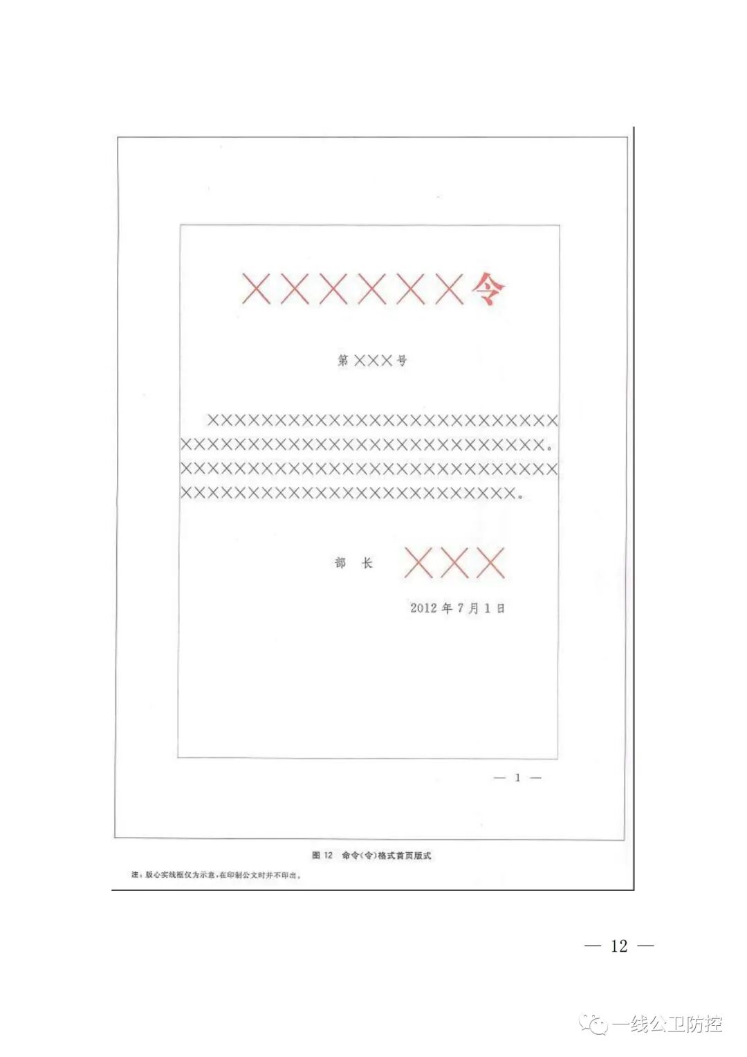 A4型公文用纸页边及版心尺寸见图1;公文首页版式见图2;联合行文公文首页版式1见图3;联合行文公文首页版式2见图4;公文末页版式1见图5;公文末页版式2见图6;联合行文公文末页版式1见图7;联合行文公文末页版式2见图8;附件说明页版式见图9;带附件公文末页版式见图10;信函格式首页版式见图11;命令(令)格式首页版式见图12。