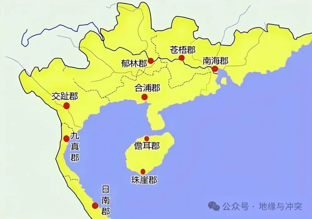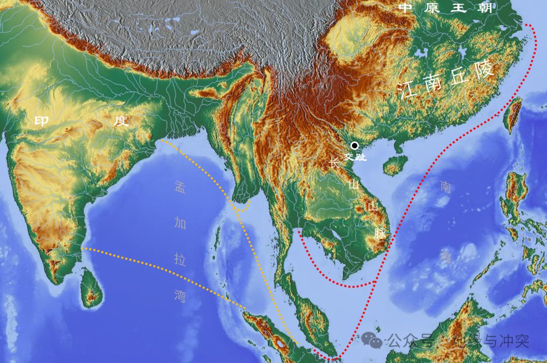 中国在越南的交趾郡和东南亚腹地之间存在一条南北狭长的长山山脉,自始至终,中国和后来的越南都没有突破这条山脉。