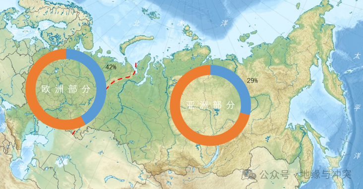 俄罗斯地跨欧亚两大洲,欧洲部分420余万平方公里,占欧洲总面积40%以上,亚洲部分1280余万平方公里,占亚洲总面积的29%。东西长9000公里,南北宽4000公里,是全球领土面积首屈一指的存在。资源总量和战略纵深无与伦比。