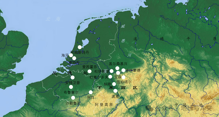 位于莱茵河口的尼德兰地势很低,滩涂沼泽遍布,深受咸潮之害,早期只存在若干贸易据点,内陆海拔稍高地区以畜牧业为主,西欧殖民开启后,尼德兰依托莱茵河的海陆联运和北海的贸易中心优势,成为欧洲商业和金融中心。