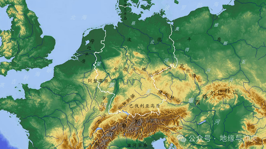 西部莱茵河发源于阿尔卑斯山,自南向北流入北海,南部多瑙河发源于巴伐利亚高原,一路东南注入黑海,北部有相对平行的易北河、奥得河、维斯瓦河等自南向北注入北海和波罗的海。