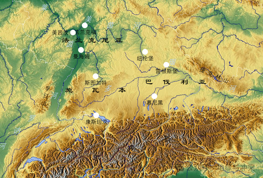 位于德意志西南部的施瓦本、巴伐利亚和法兰克尼亚,虽然大多为山地高原,但却是德意志农业条件最好的地方,这里纬度较低,降水适宜,巴伐利亚高原和莱茵河谷平原沃野千里,至今为德国核心农业区。